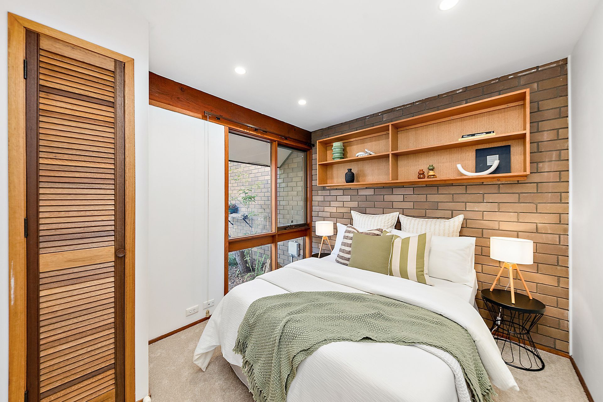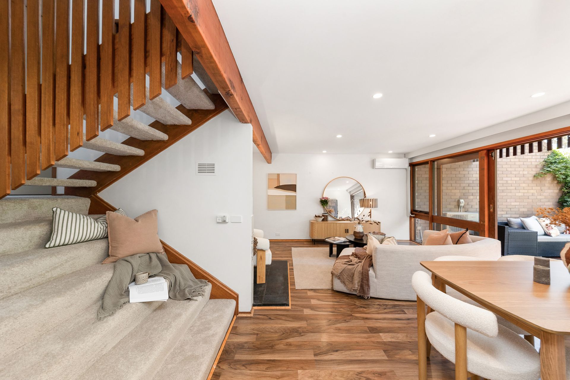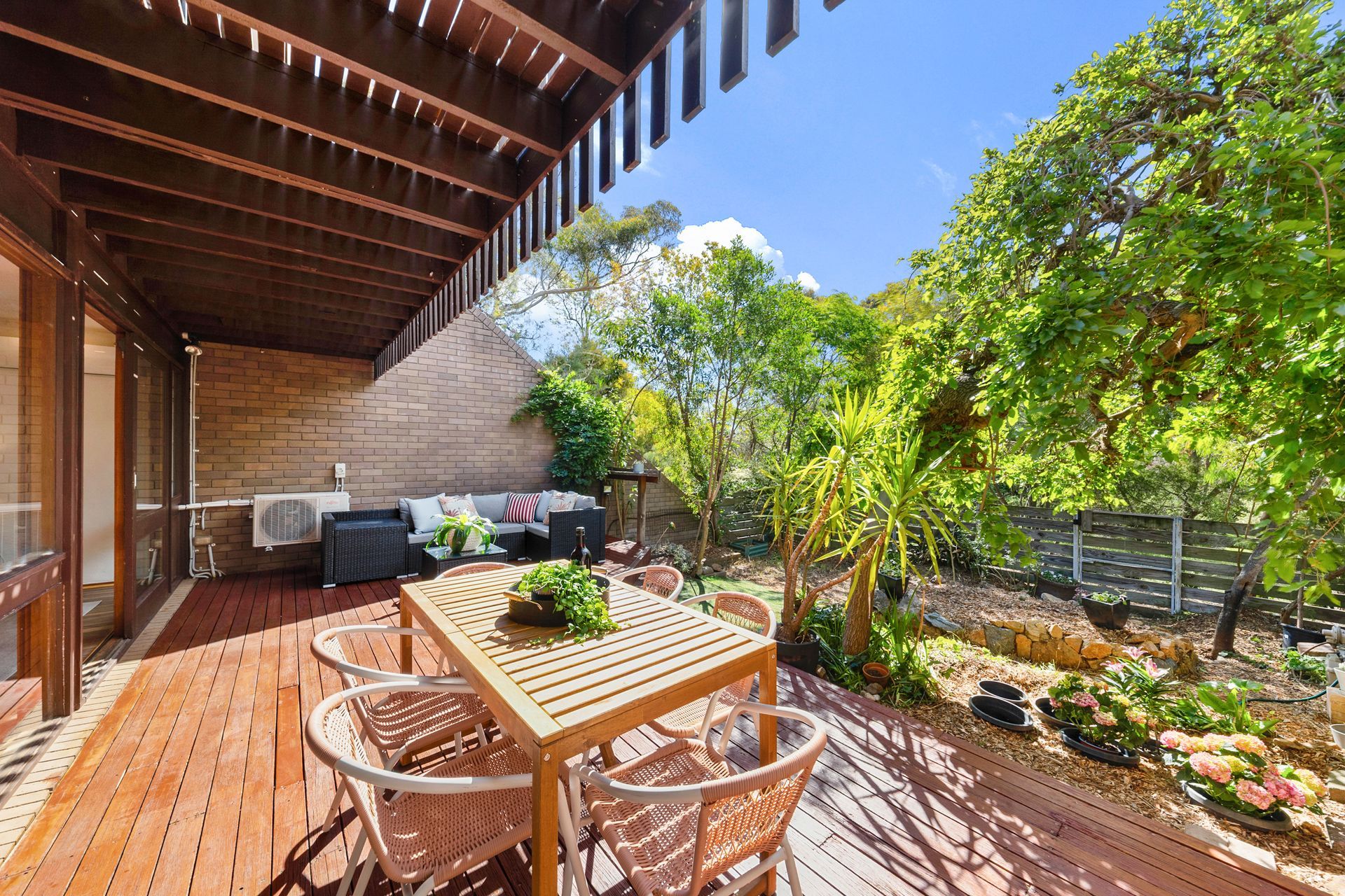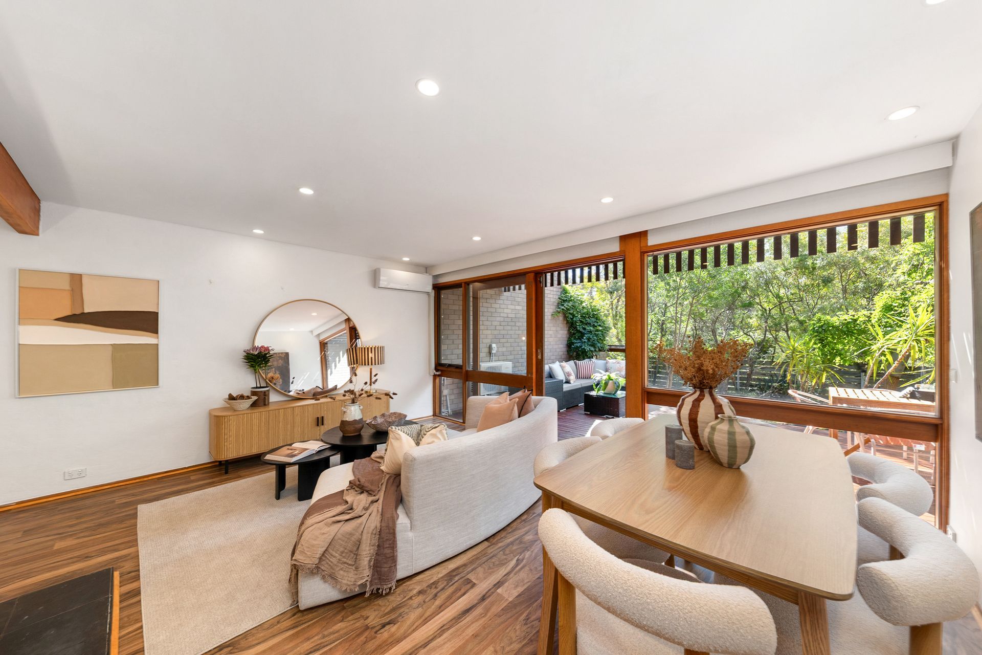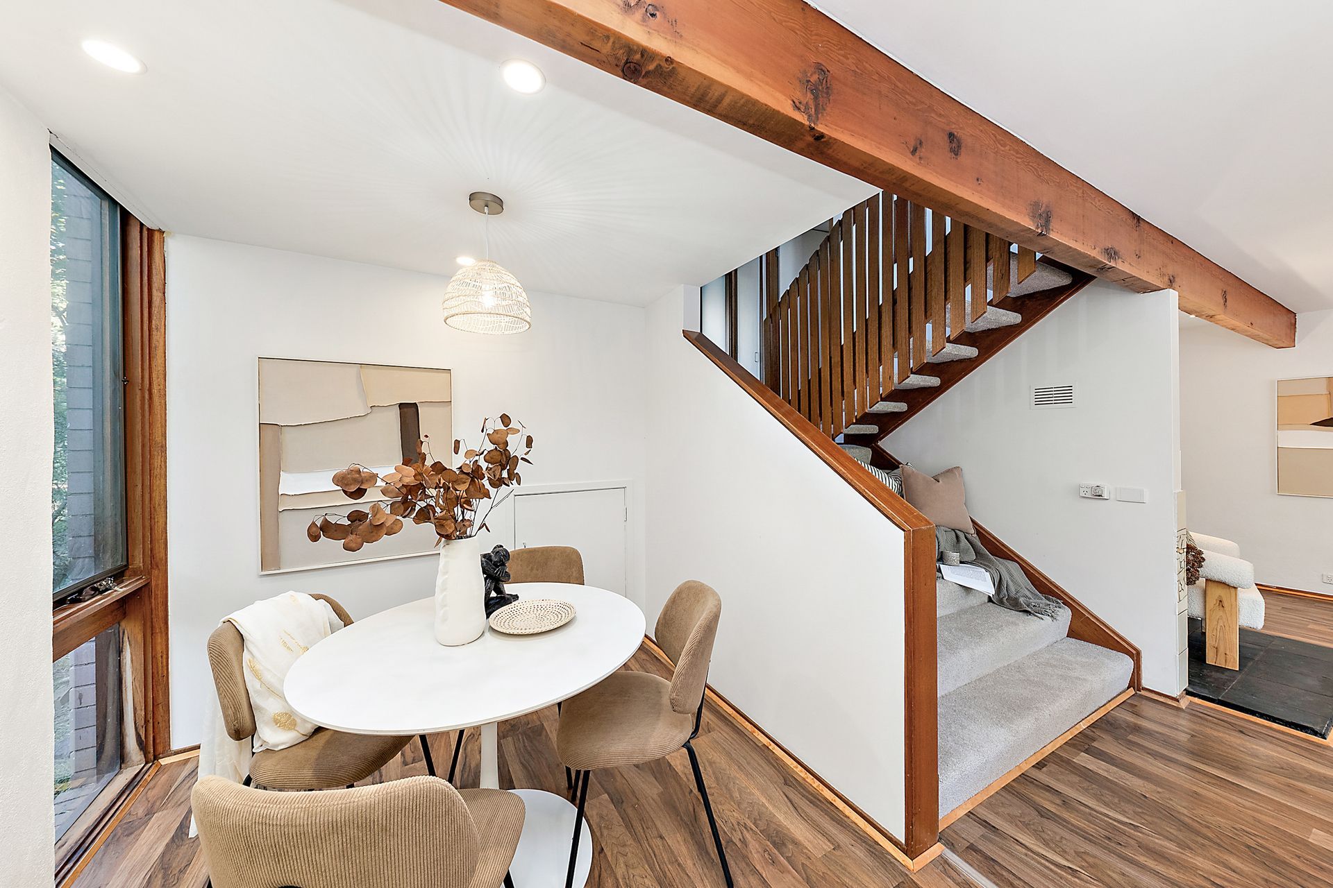 Nestled within Michael Dysart’s celebrated Wybalena Grove — a landmark example of 1970s Sydney Regional architecture — this townhouse sits gently among the eucalypts, its muted materials and angular rooflines blending seamlessly with the bush setting. Inside, the development’s signature openness shines through, with split levels, raked ceilings and interconnected spaces creating a calm, airy flow.