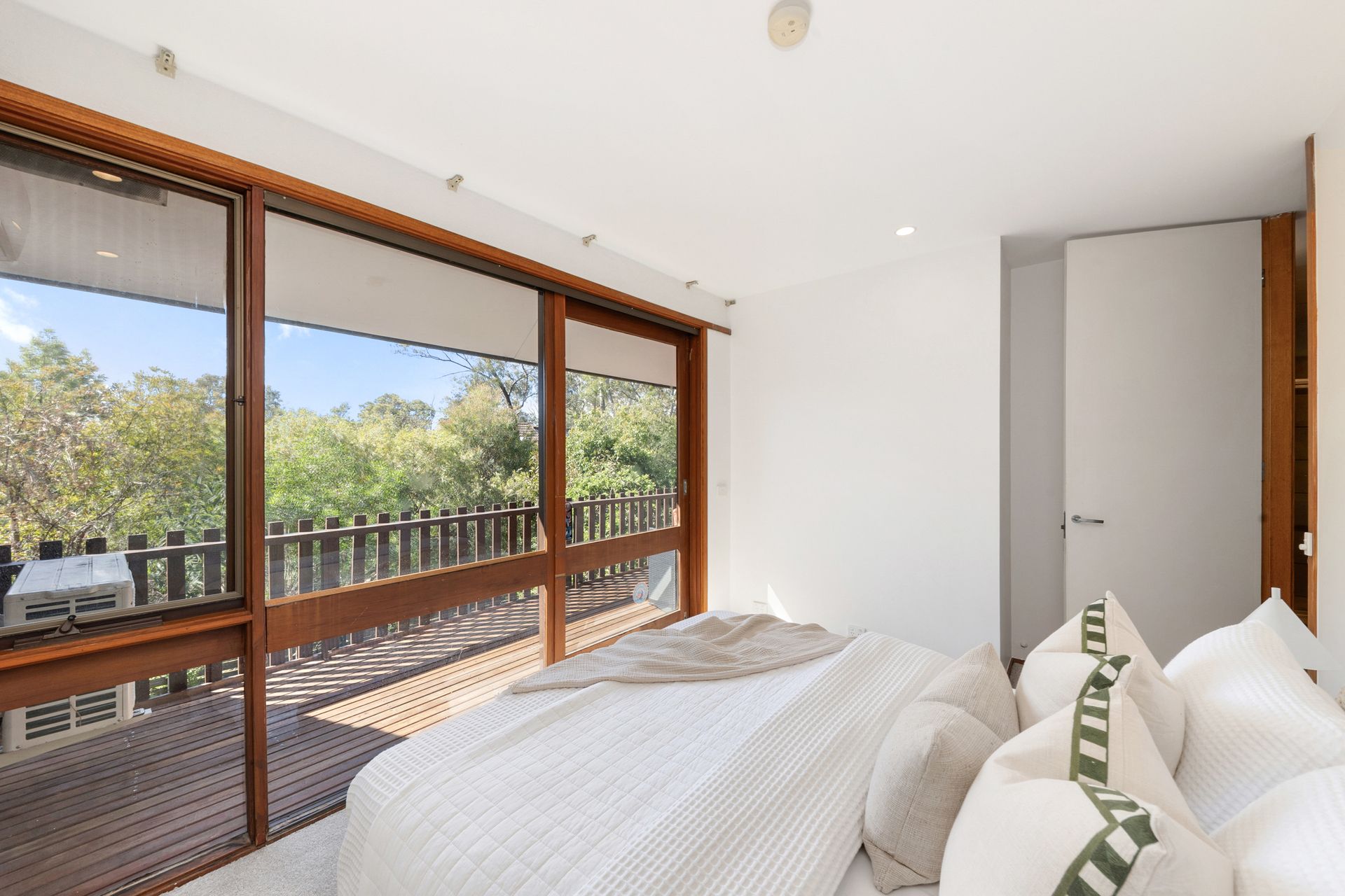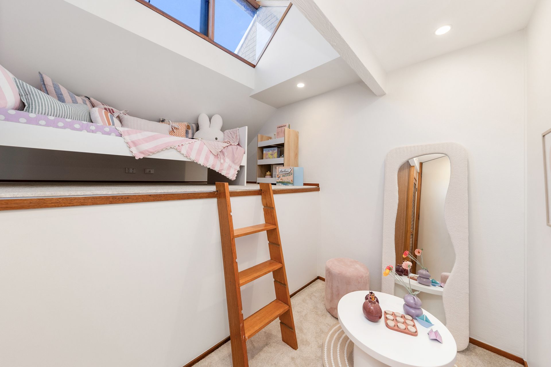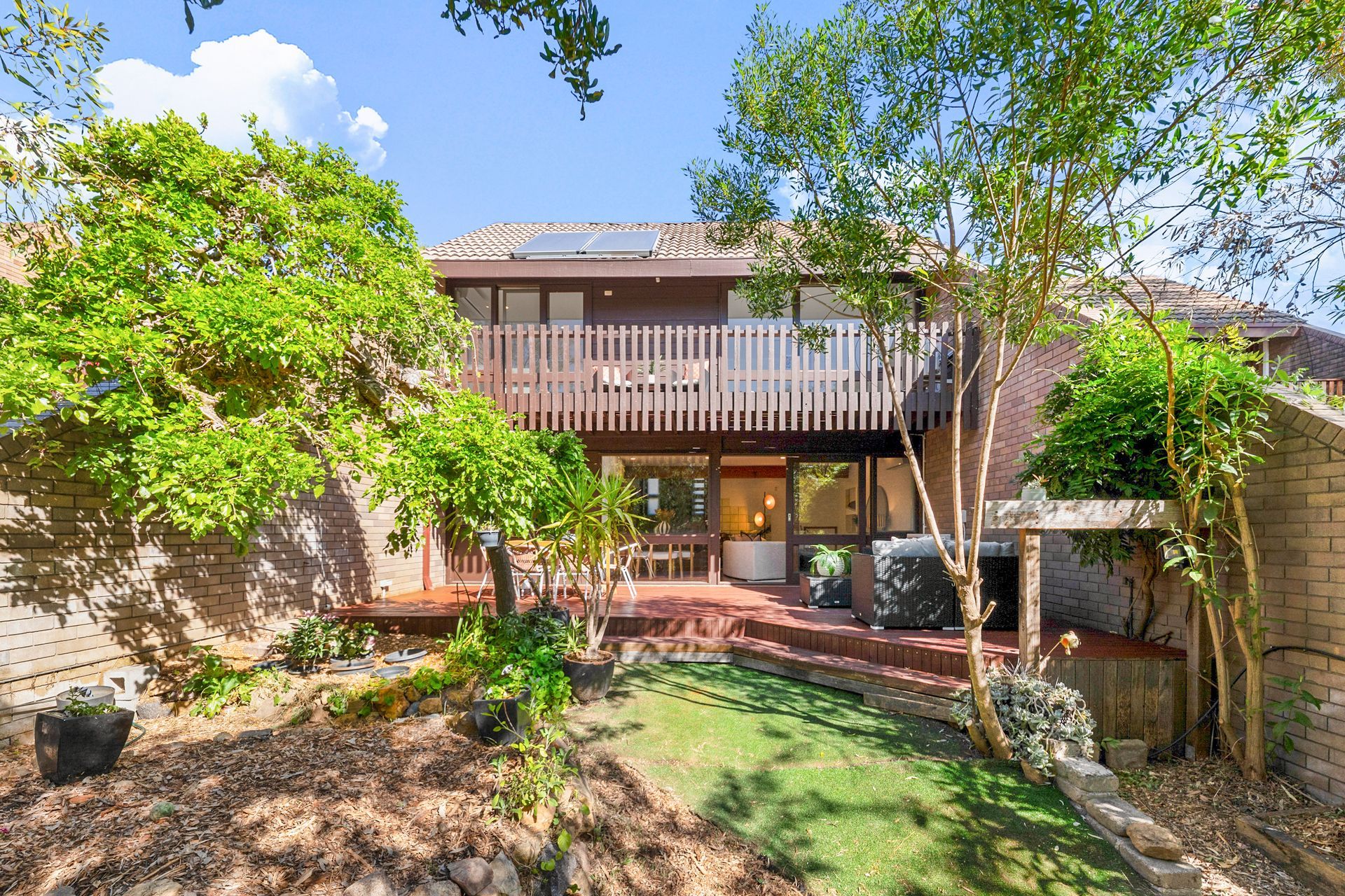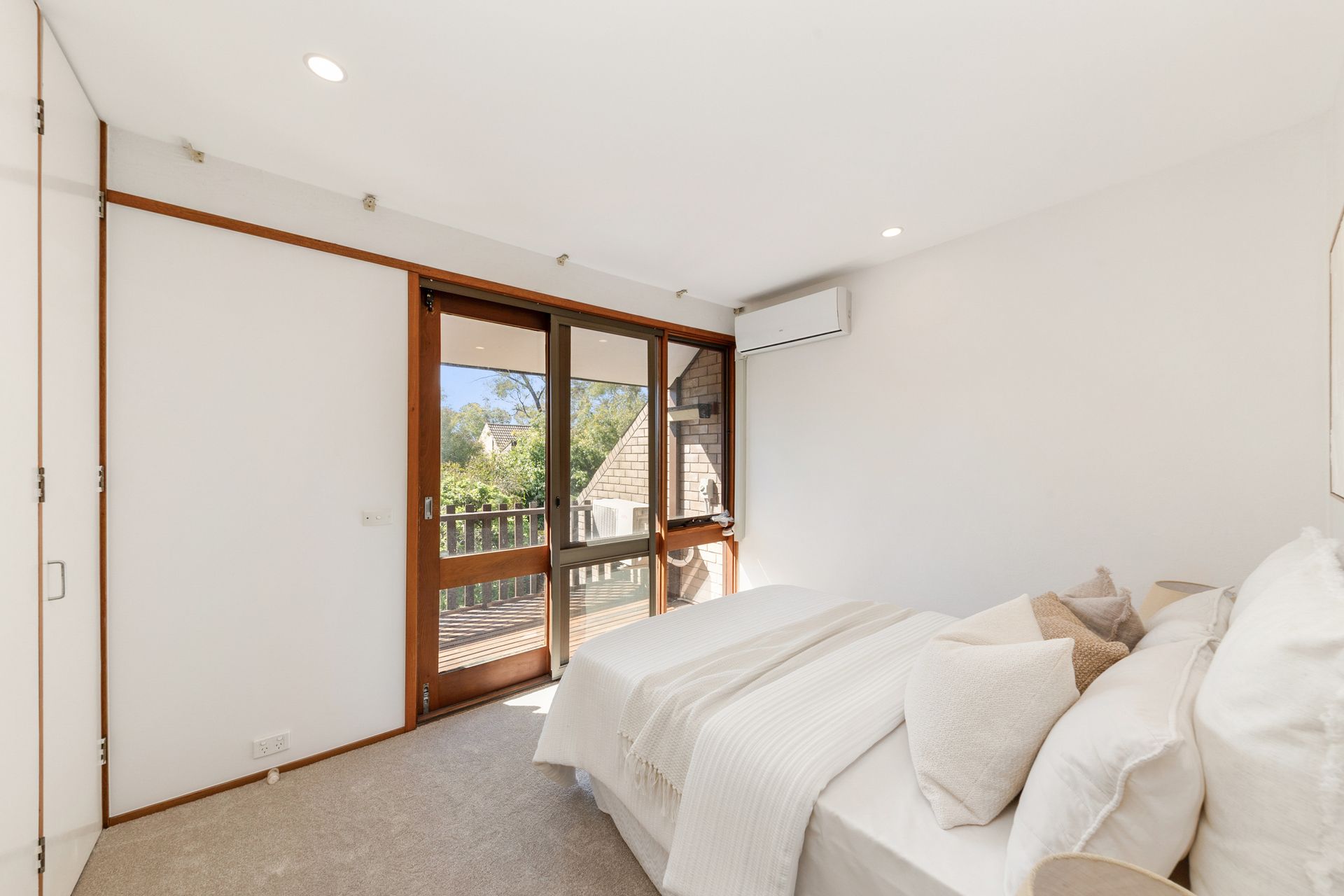 Nestled within Michael Dysart’s celebrated Wybalena Grove — a landmark example of 1970s Sydney Regional architecture — this townhouse sits gently among the eucalypts, its muted materials and angular rooflines blending seamlessly with the bush setting. Inside, the development’s signature openness shines through, with split levels, raked ceilings and interconnected spaces creating a calm, airy flow.